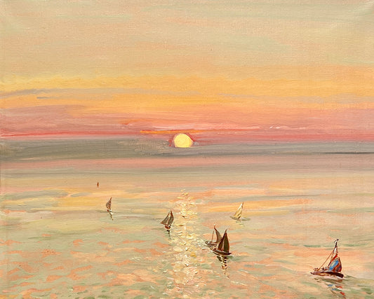 Phillipa Jacobs (b.1939) Sailboat Sunset At Sea Oil on Canvas in Navy Gold Frame