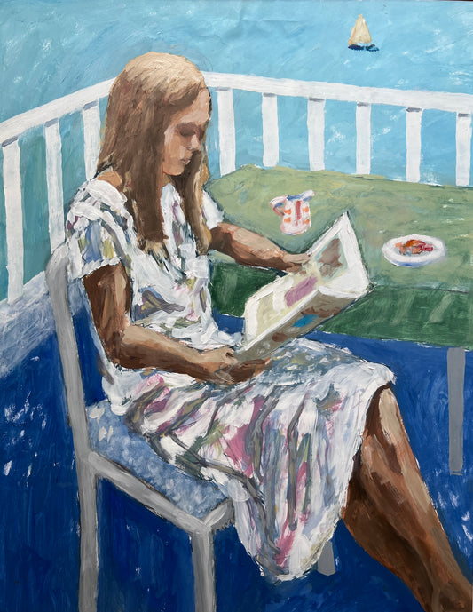 Seaside Portrait of a Girl "Trudy on the Balcony / Cannes, France" Oil Painting in Natural Wood Frame