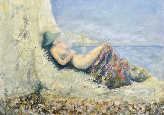 Contemporary Tranquil Nude Sunbather Oil Painting in Gold Frame