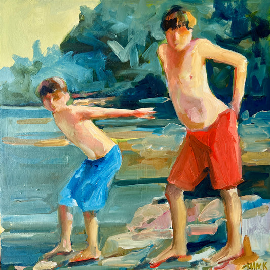 Kathleen Mack Impressionist Portrait Summer Brothers' Plunge Oil Painting in Wood Frame