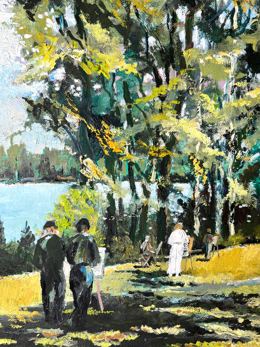 Contemporary Portrait of Plein Air Artists by the Lake in Gold and Black Frame