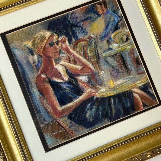 Contemporary Pastel "Sidewalk Cafe" Portrait of Blonde Woman Urban Street Scene in Gold Frame