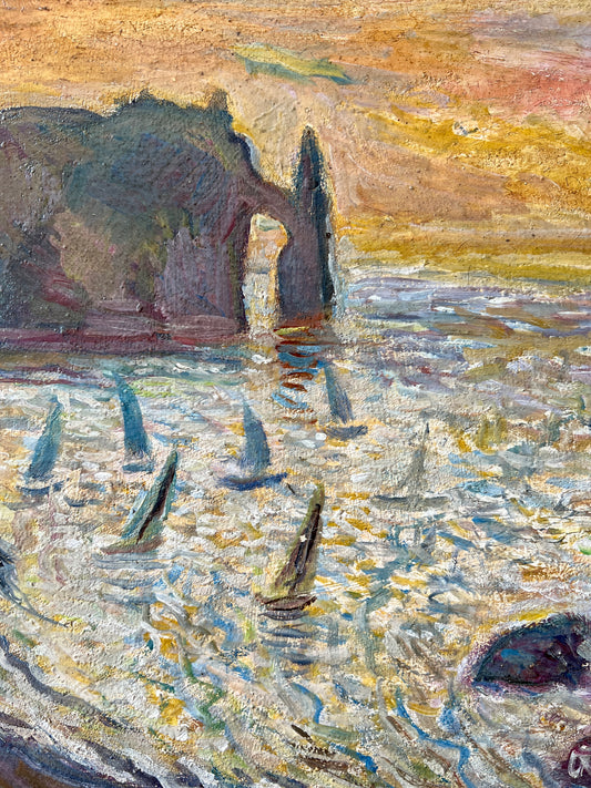 Vintage Regatta at the White Cliffs of Etretat Normandy, France Oil Painting in Gold Frame
