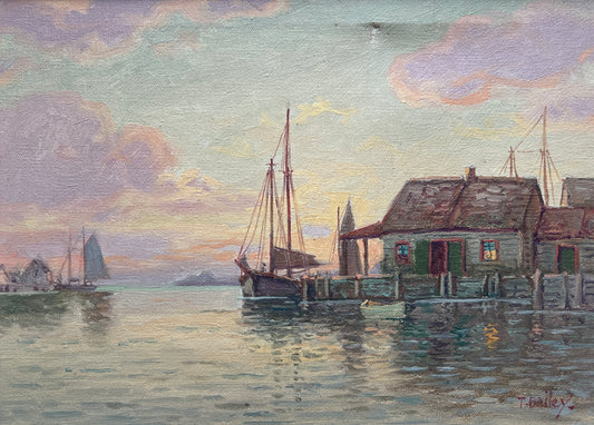 T. Bailey 1932 Gloucester, MA Sailboat Harbor Scene Oil Painting in Gold Frame