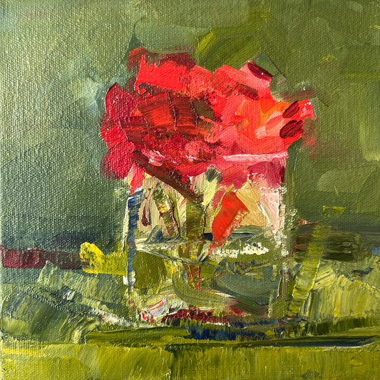 Paula Jackson Modern Red Flowers in a Glass Jar Still Life Oil Painting in Gold Floater Frame