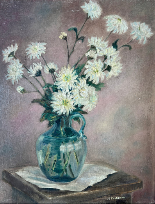Mid Century Still Life Daisies Flower in Blue - Green Glass Jar Oil Painting in Gold Frame