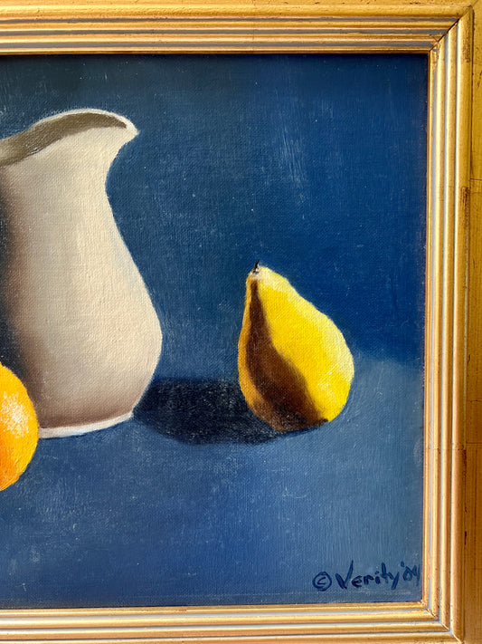 Contemporary Navy Still Life of Apple, Orange, Pear and White Pitcher in Gold Frame