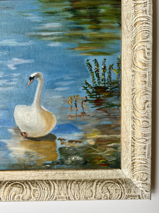 Vintage 1970 "The Swans" Oil Painting in Ornate White Gold Frame