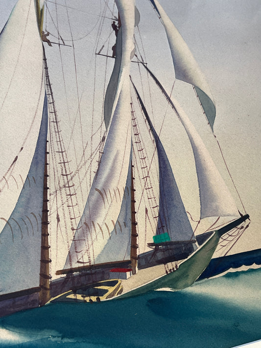 Sandor Bernath (American, 1892-1984) Watercolor Painting of Sailboat with American Flag in Silver Frame