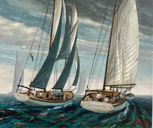 Large Gouache Painting of Bacchus and Ariadne Sailboats in Seascape Carved Gold Frame