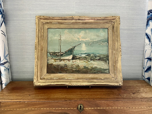 Late 19th Century Impressionist Blue Fishing Boat Seascape Oil Painting in Gold Frame