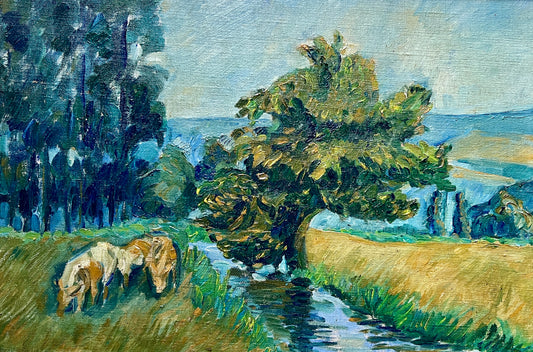 20th C. Impressionist Horses Grazing on Summer Day Oil Painting in Scalloped Gold Frame