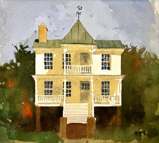 Vintage Small Town Houses Under a Sycamore Tree Watercolor Painting in Gold Frame