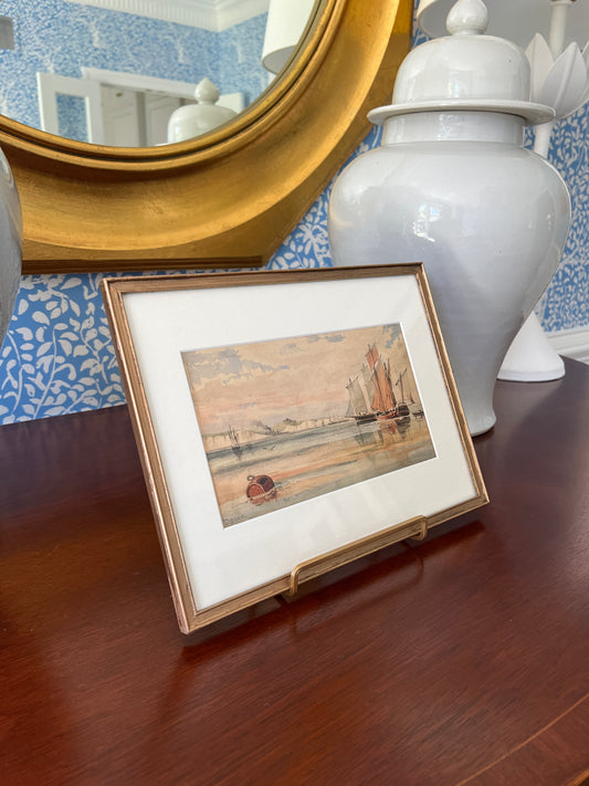 19th Century Tall Sail Ships in Harbor Seascape Watercolor Painting