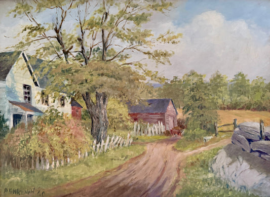 Vintage Blue Skied Country Landscape with White Farmhouse in Gold Frame