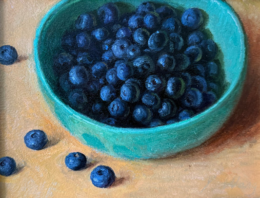 Blueberries in Green Ceramic Bowl Realist Still Life Oil Painting in Gold Frame
