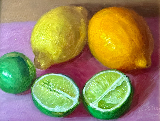 Lemons and Limes on Pink Cloth Realist Still Life Oil Painting in Gold Frame