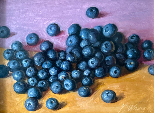 Blueberries on Pink and Orange Realist Still Life Oil Painting in Gold Frame