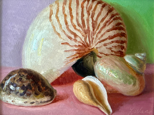 Seashell Collection on Pink Realist Still Life Oil Painting in Gold Frame