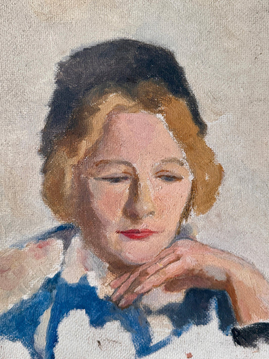 Mid Century French Portrait of a Woman in Black Hat Oil Painting in Black and Gold Frame