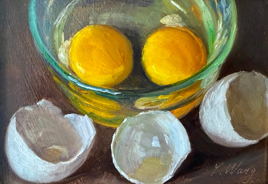 Cracked Eggs in Glass Bowl Realist Still Life Oil Painting in Gold Frame