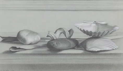Judith Goldsmith Realist Mantelpiece I Still Life Graphite Drawing Seashells and Beach Stones in Gold Frame