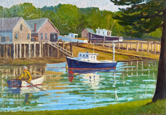 Robert Gordon Working Harbor East Boothbay Maine Yellow Jacket Fisherman Oil Painting in Gold Frame