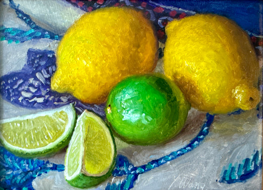 Lemons and Limes on Blue and White Tablecloth Realist Still Life Oil Painting in Gold Frame