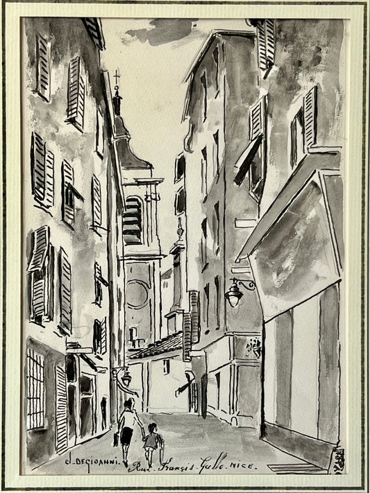 Vintage French Ink Painting Mother and Child French Cityscape Rue Francis Gallo Nice, France in Gold Frame