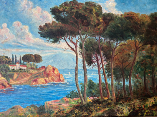 Mid Century European Coastal Landscape with Sailboats Oil Painting in Gold Frame