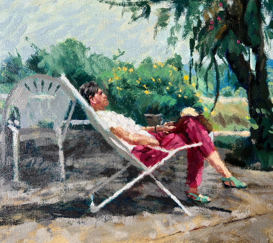 David Wilson (1919-2013) "Francoise And Tamarind Montseveroux France" Garden Nap Oil Painting in Gold Frame