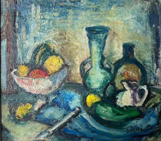Mid Century Fauvist Style Colorful Tabletop Fruit Bowl Still Life in Thick Gold Frame