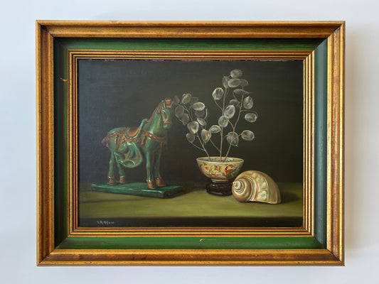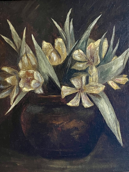 Antique Yellow Tulips in Stoneware Vase Dark Still Life Painting in Carved Frame