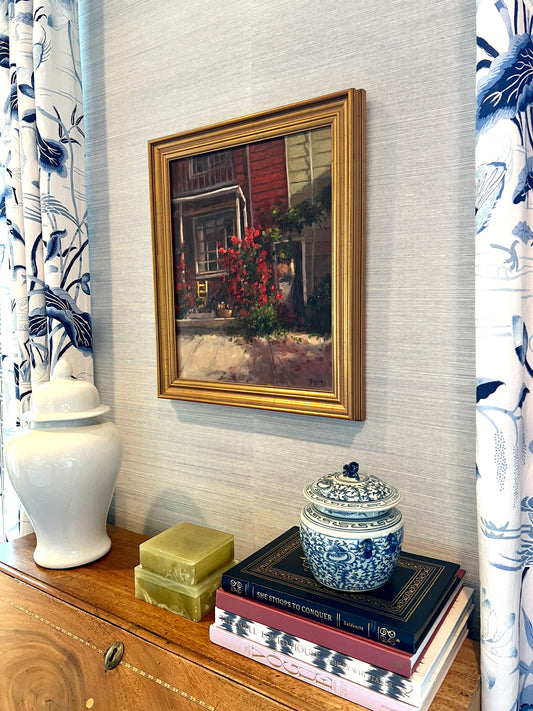 Small Town Houses Front Porch Scene Oil Painting in Gold Frame