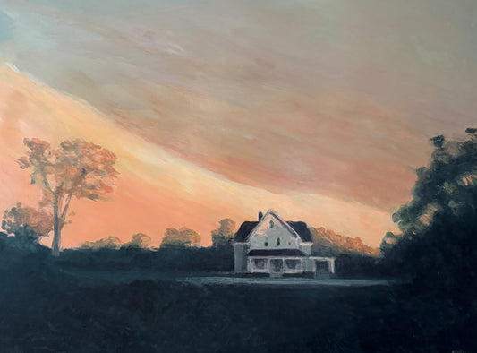 Luminous Country Farmhouse Landscape Sunset Oil Painting in Gold Frame