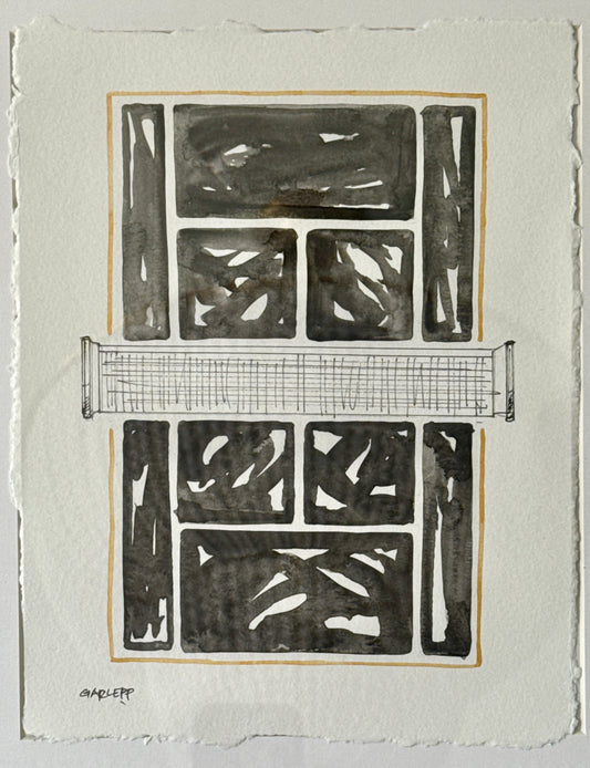 Sharon Garlepp Black and Gold Tennis Time Watercolor Painting in Natural Wood Bobbin Frame