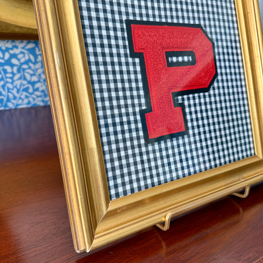 Vintage Princeton University Varsity Letter "P" on Black and White Gingham in Gold Frame
