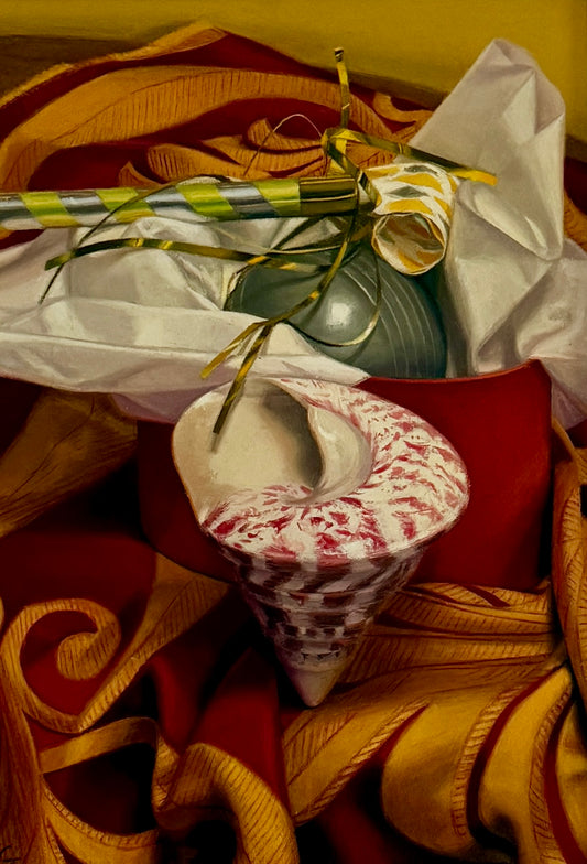 Judith Goldsmith Overture Conch Shell Silk Scarf Hyper-Realist Still Life Oil Painting in Gold Frame