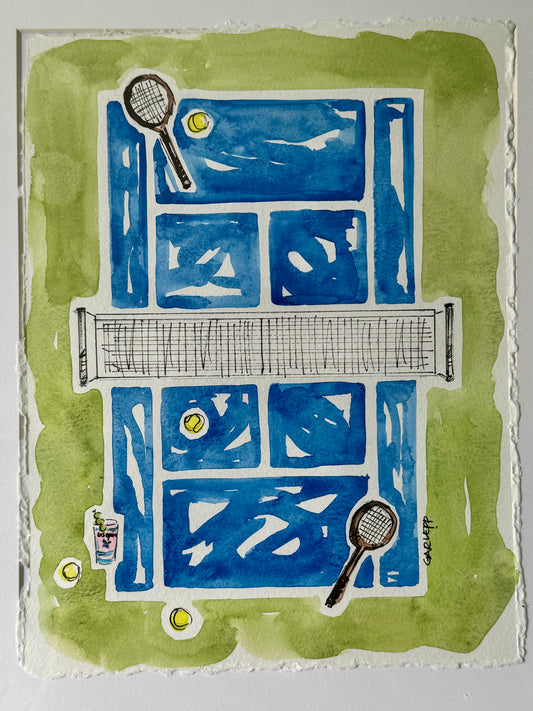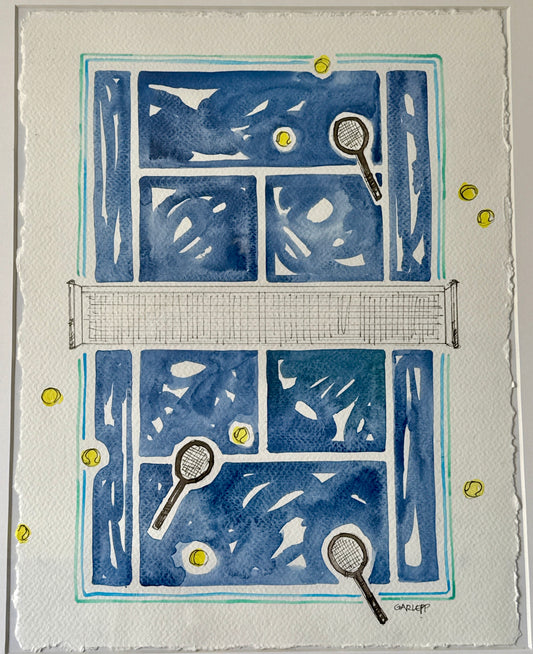 Sharon Garlepp Blue Green Court Tennis Time Watercolor Painting in Natural Wood Bobbin Frame