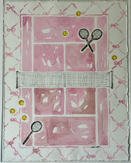 Sharon Garlepp Pink Ribbon Bows Court Tennis Time Watercolor Painting in Natural Wood Bobbin Frame
