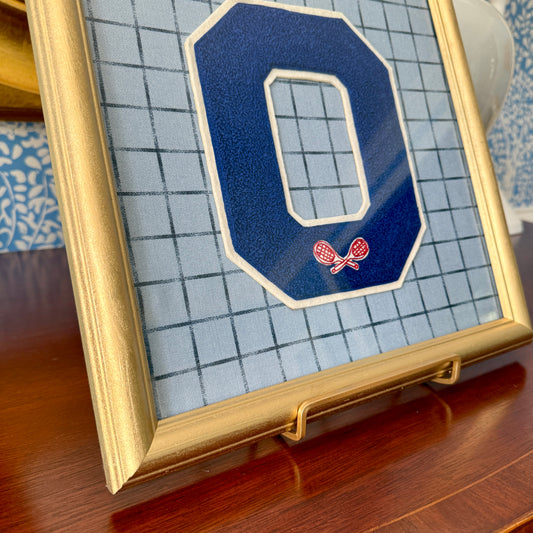 Vintage Large Varsity Tennis Initial Letter "O" on Blue Windowpane Fabric in Gold Frame