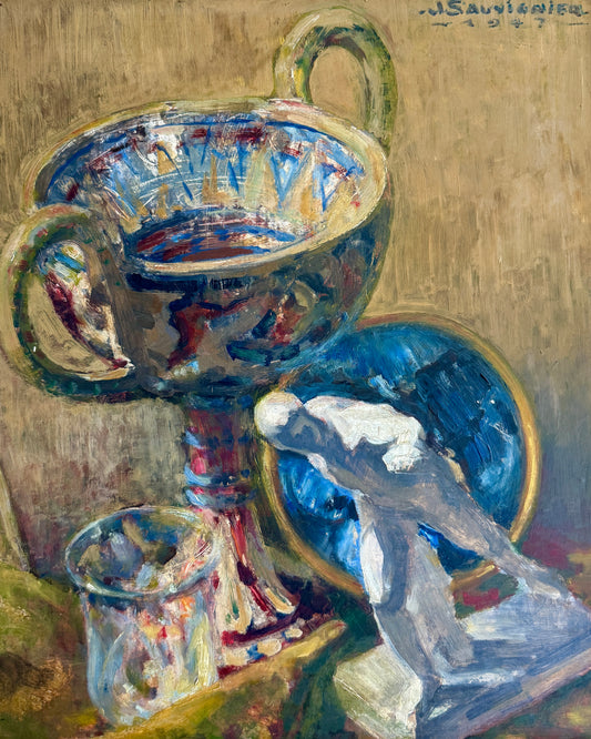 • Jean Sauvignier 1947 Ancient Greek French Still Life Nature Morte Oil Painting in Washed Wood Frame