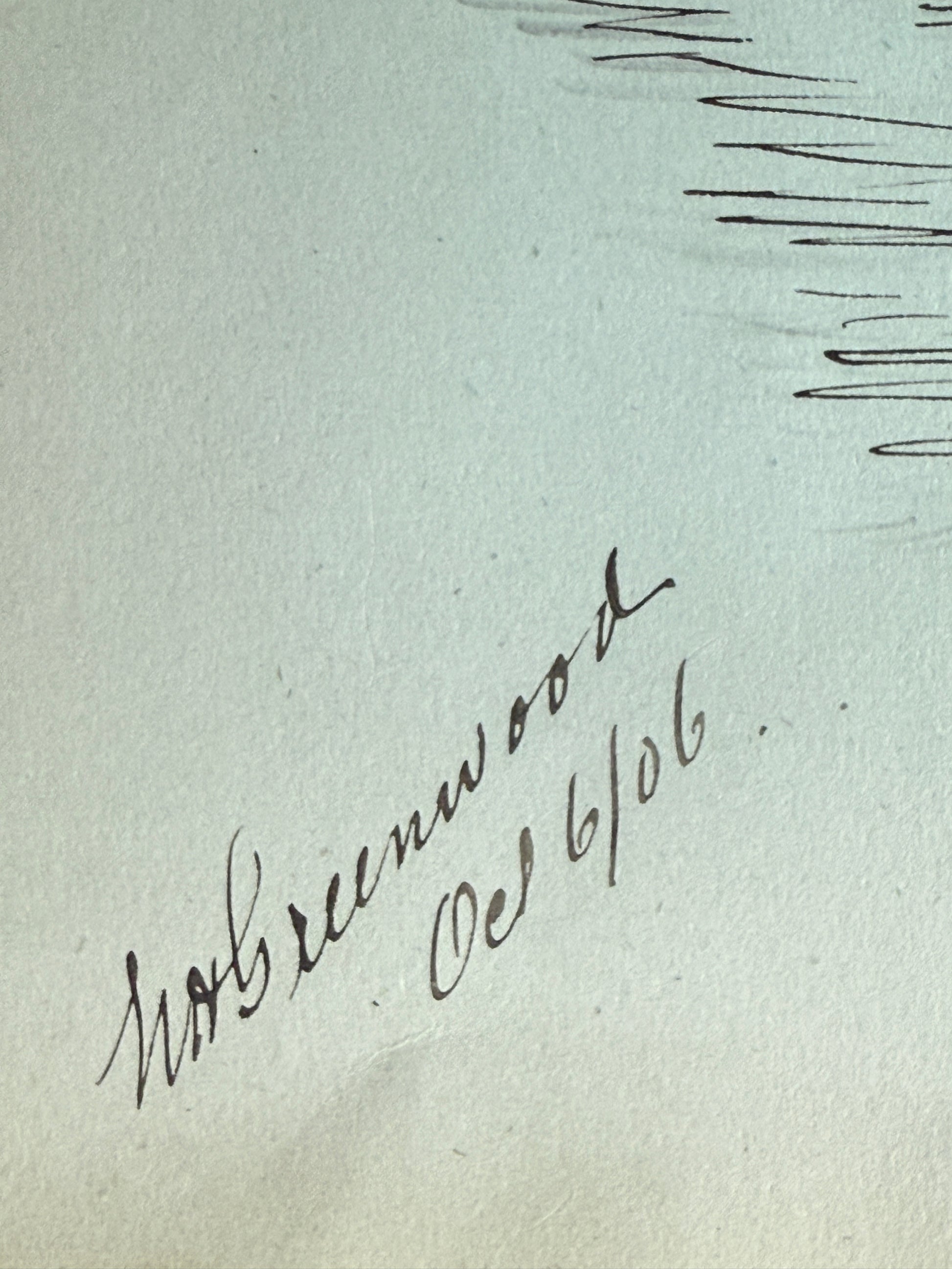 A charming 1906 ink drawing of ships in a rough seascape. Small passengers can be seen on board. Titled Outward Bound. Signed and dated June 1906 at lower left. Under acrylic. Artwork in red lacquered frame measures 12.25" x 15.25". Artwork in very good antique condition. Frame in very good condition. Coordinating red framed pieces are available in separate listings.