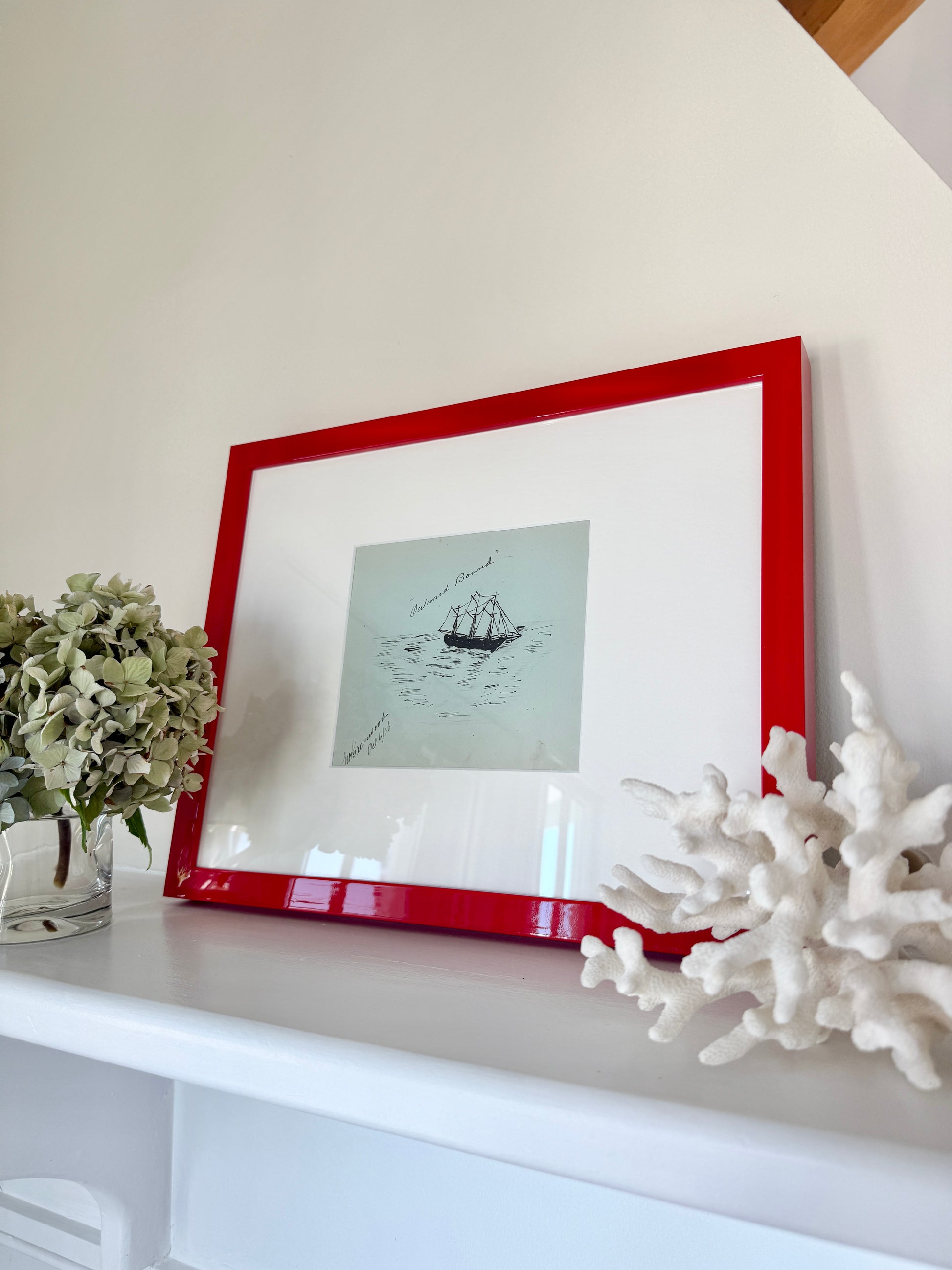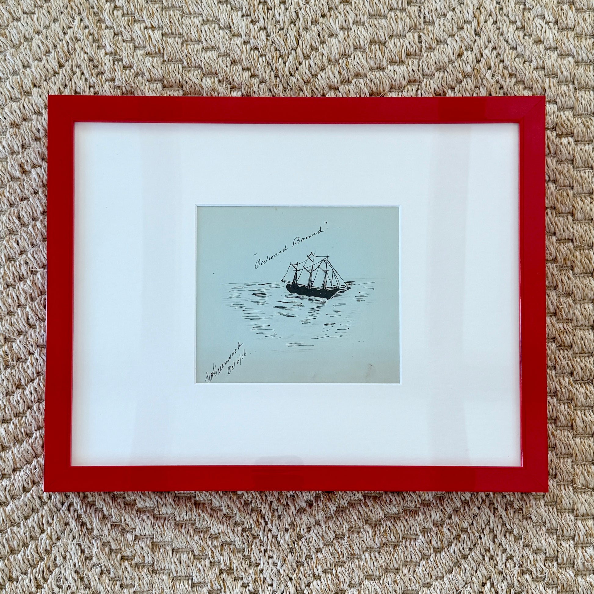 1906 Outward Bound Antique Ship Portrait Drawing in Red Lacquered Frame