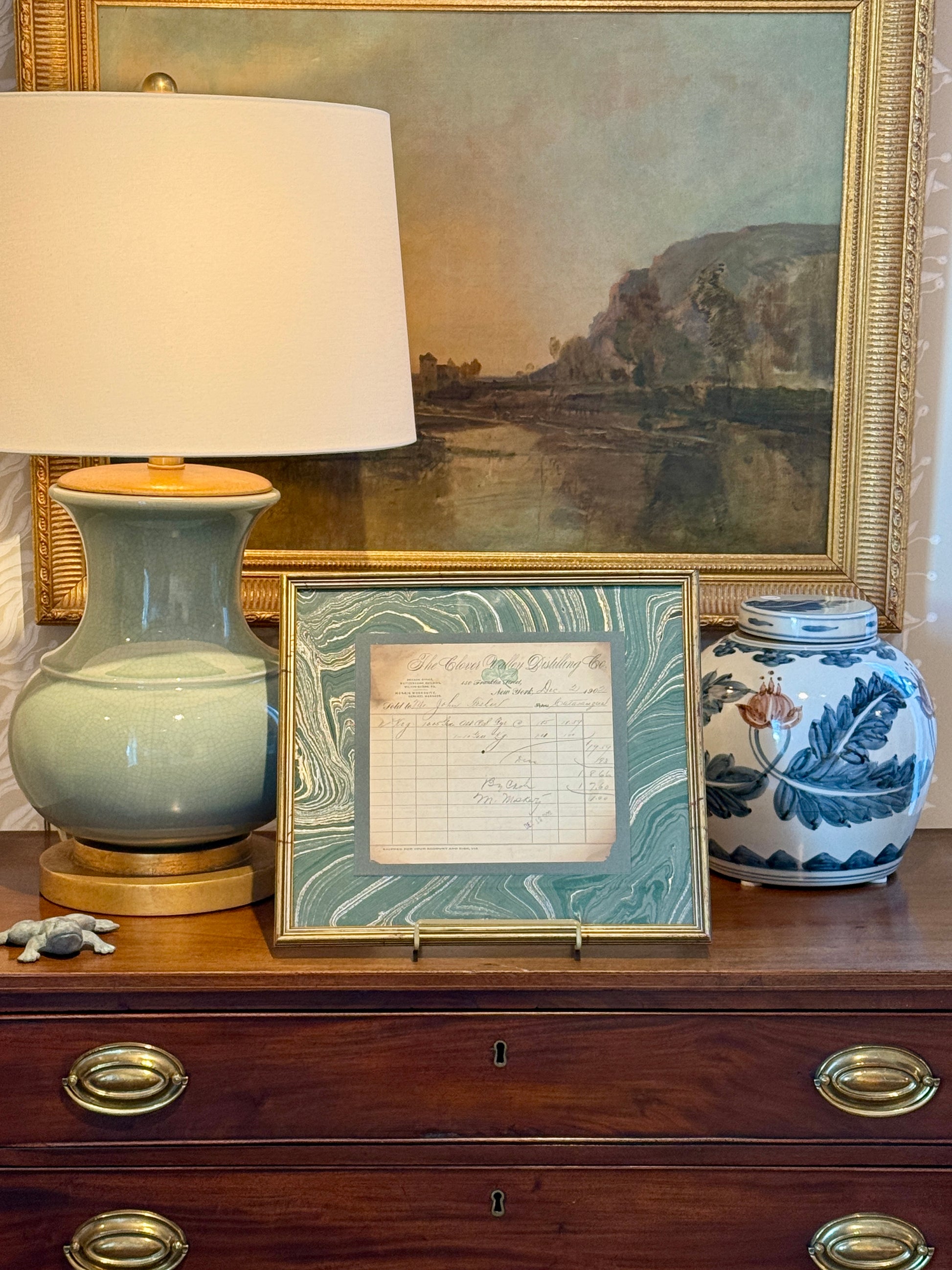 1902 receipt from The Clover Valley Distilling Company of New York for a 10 gallon keg of rye whiskey. Mounted on green hand marbled paper. Receipt in vintage gilded frame measures 13" x 14.5". Receipt and frame in very good condition with light, age appropriate wear. Coordinating piece shown in last photo is available in a separate listing.