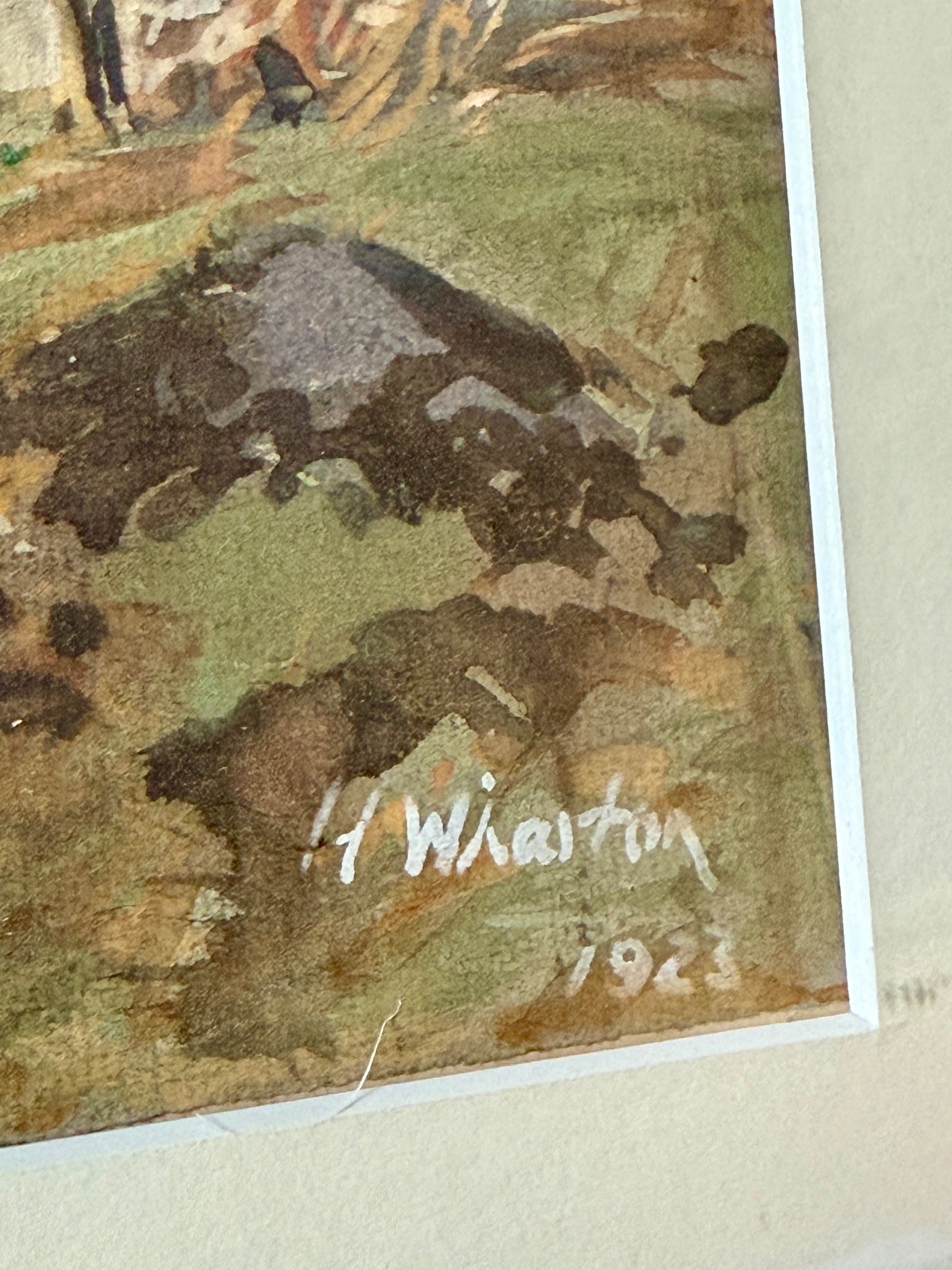 An antique, 1923 watercolor and gouache painting of a charismatic fox hunting scene depicting hunstmen and their hounds fruitlessly searching the rocky hillside for their target. Meticulously detailed. Signed and dated to the lower right. Artwork in custom gilt frame measures 20.5" x 24.75". Artwork and frame in very good condition with light wear including light marks at edging from old matting and a small paper loss at the upper right edge.