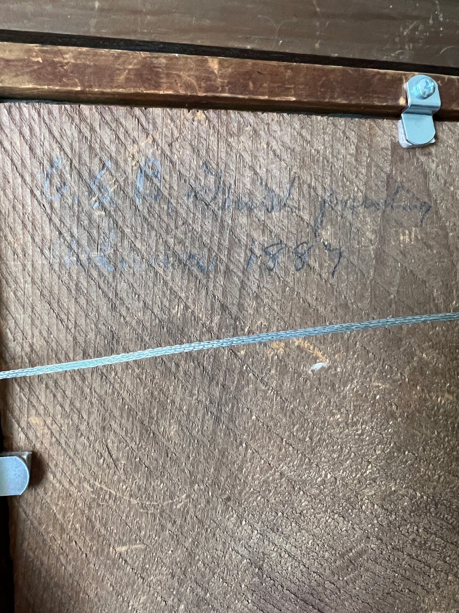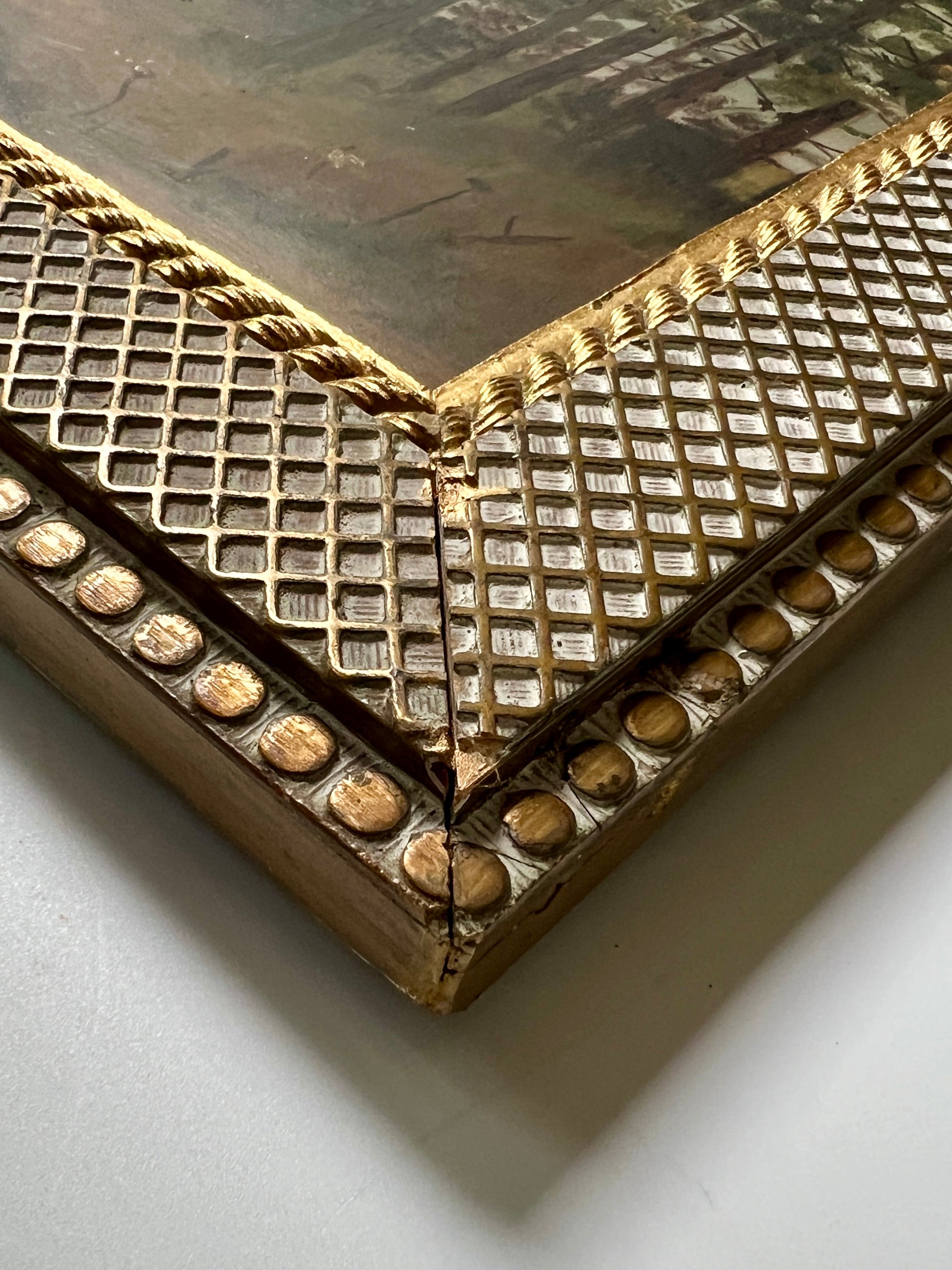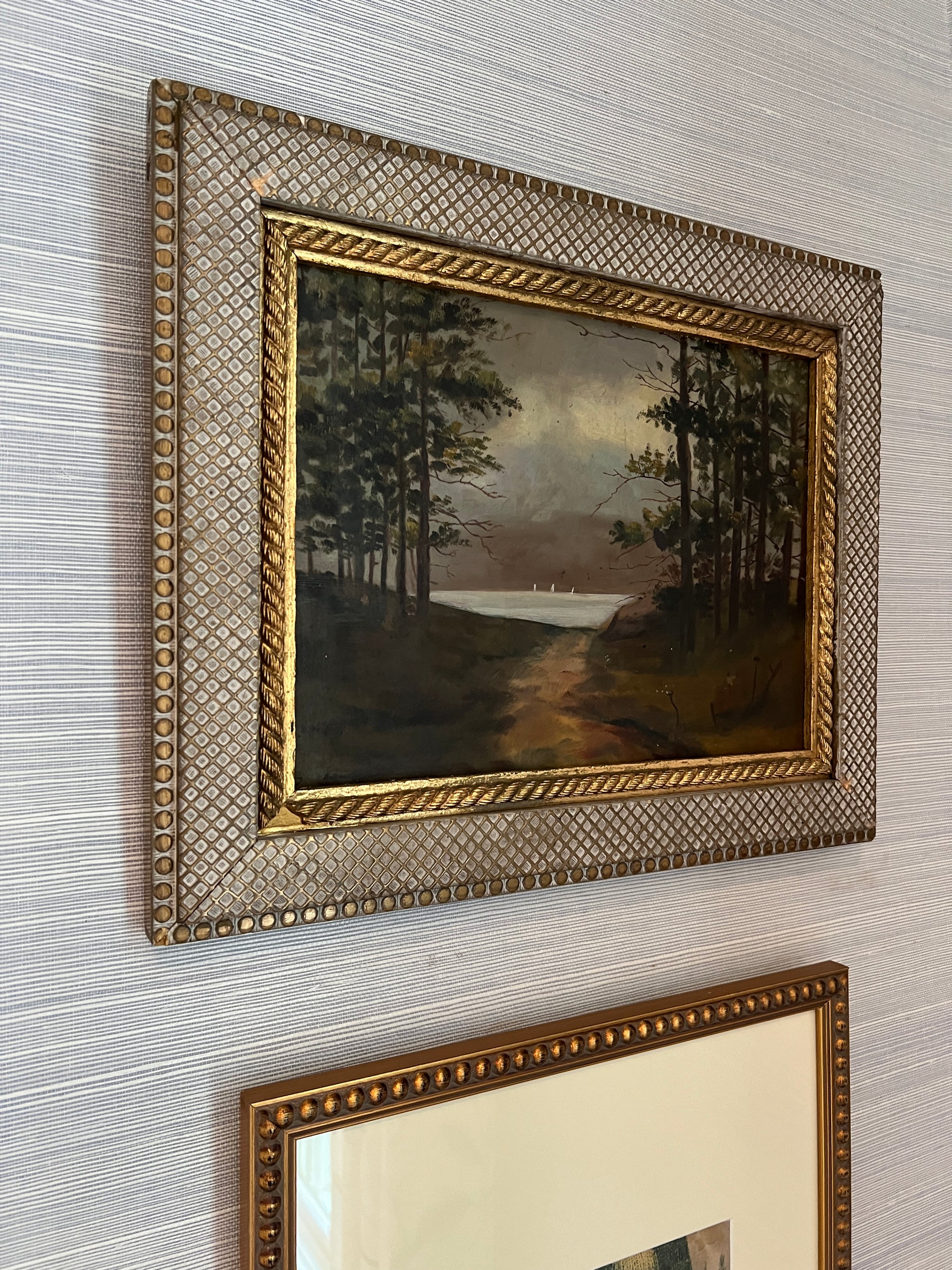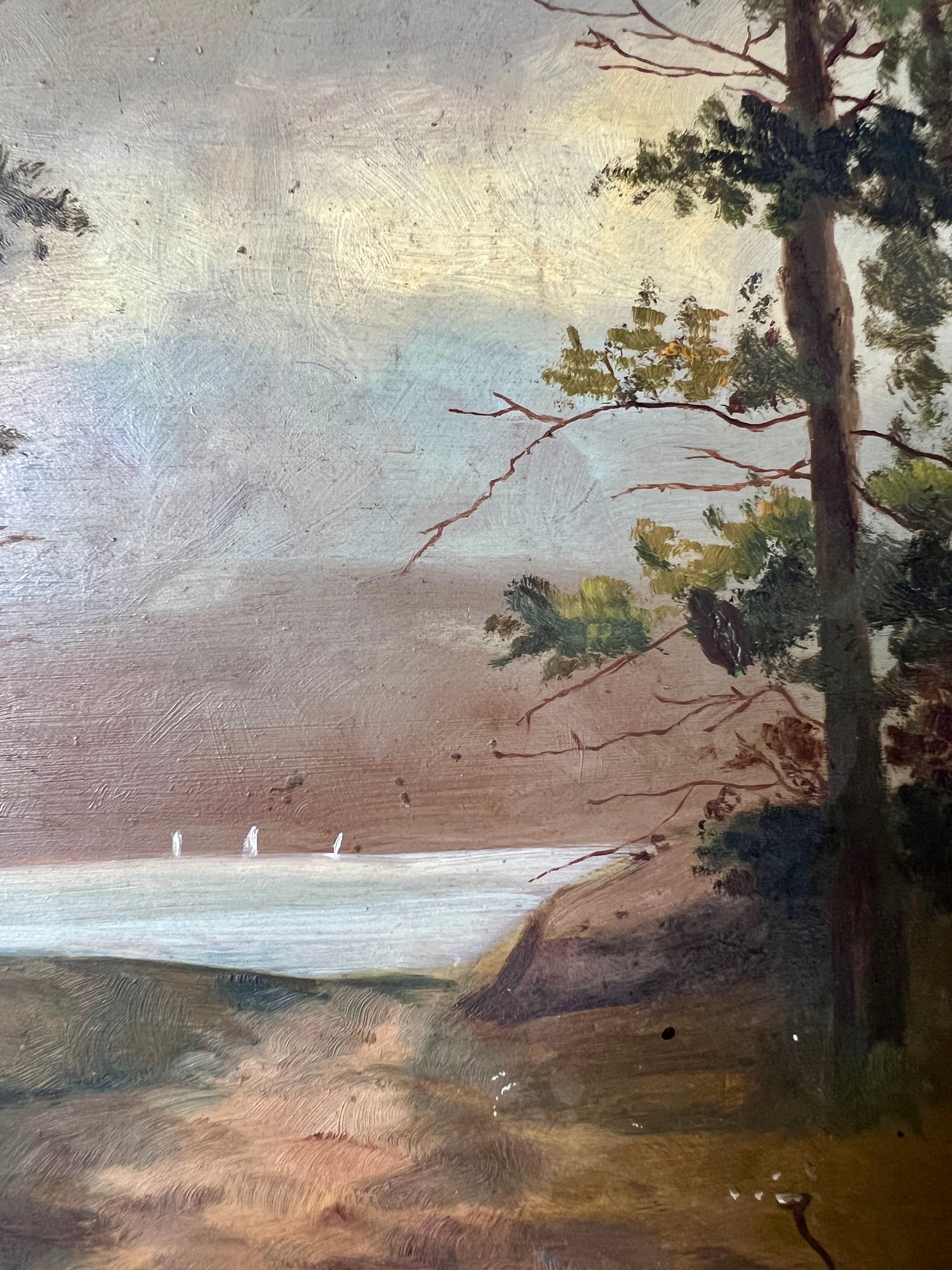 A 19th century oil painting on board of a dirt path cut through the forest to reveal sailboats on a lake. Dated 1887 on the back. Other illegible notes on the back - potentially the artist's name. It is framed in a detail-filled carved frame with gilded rope liner. Artwork in frame measures 13" x 16". The frame is in good, antique condition with scattered wear; one small portion of the gold rope liner is missing and has been touched up. The painting itself is in good, antique condition.