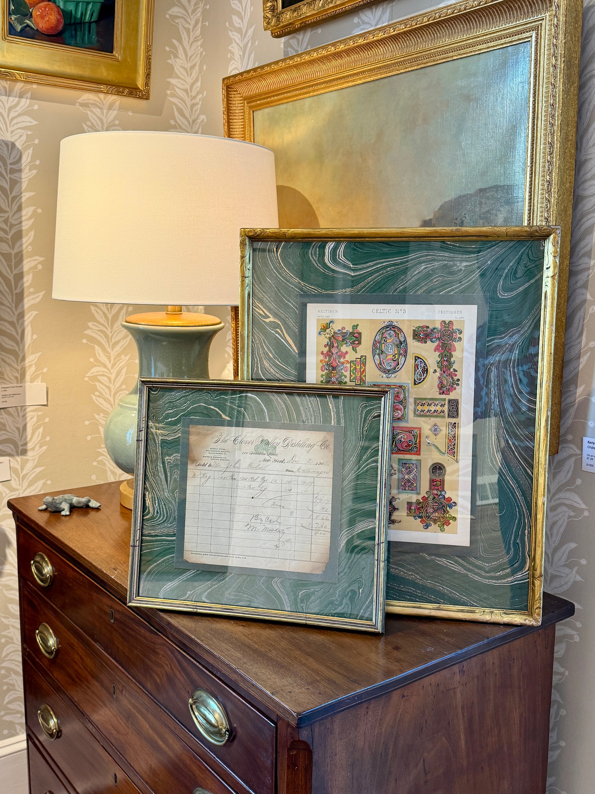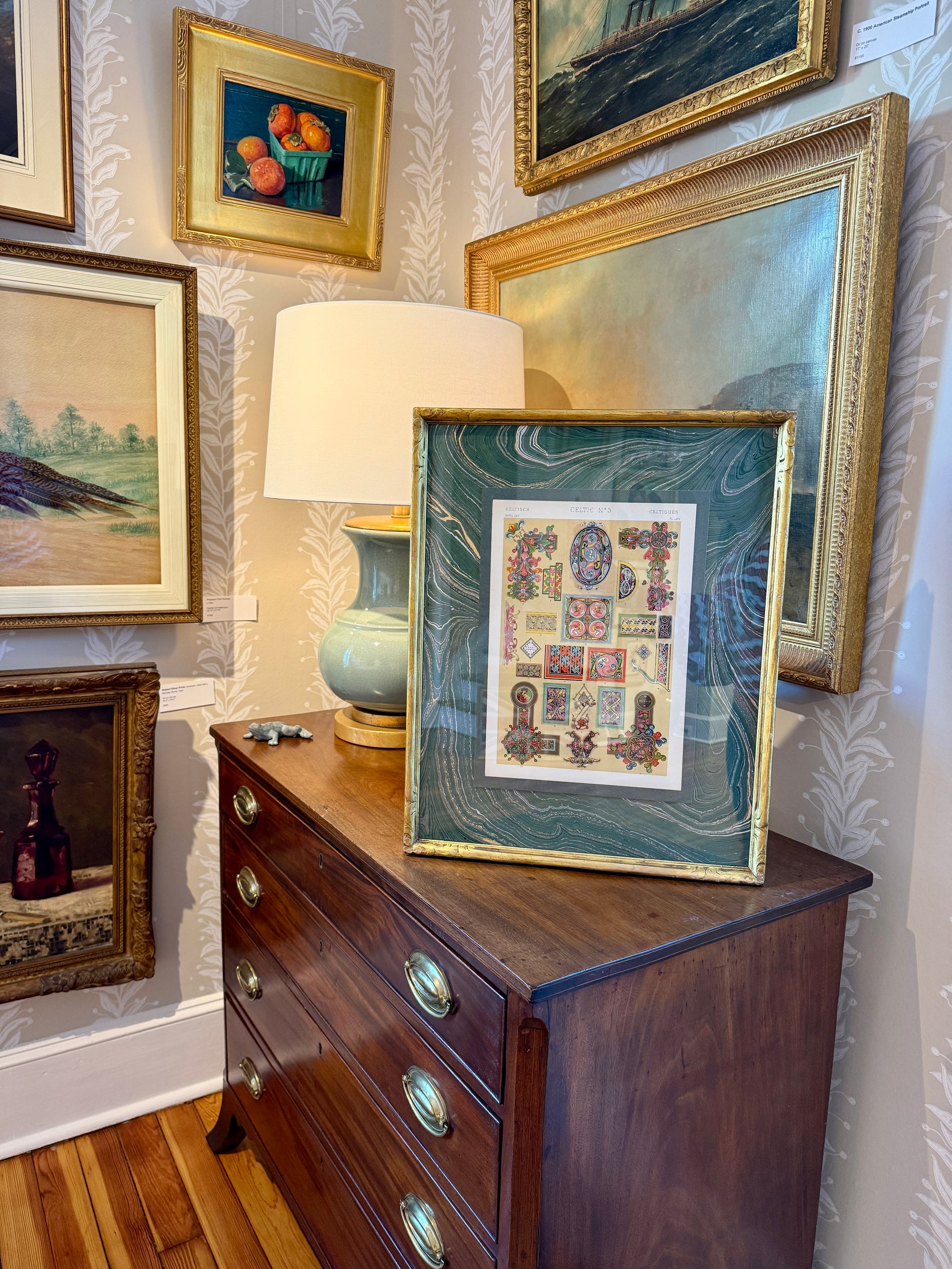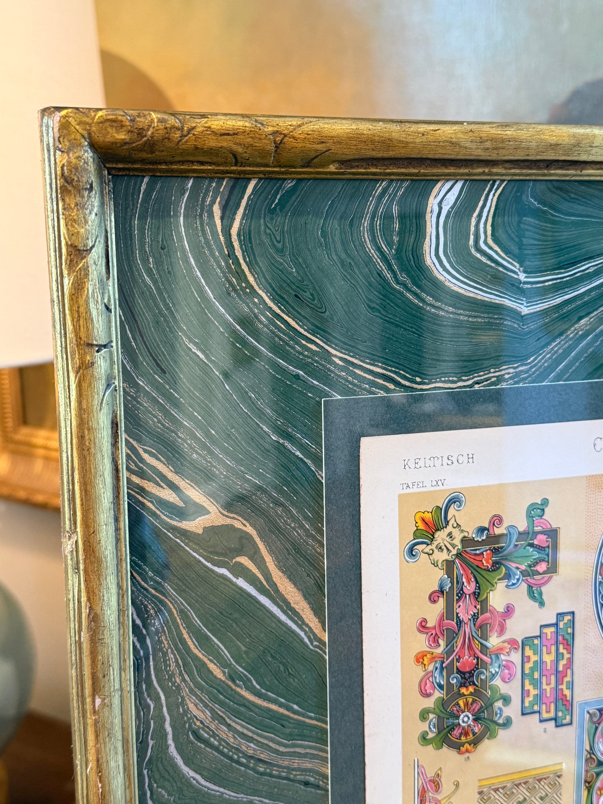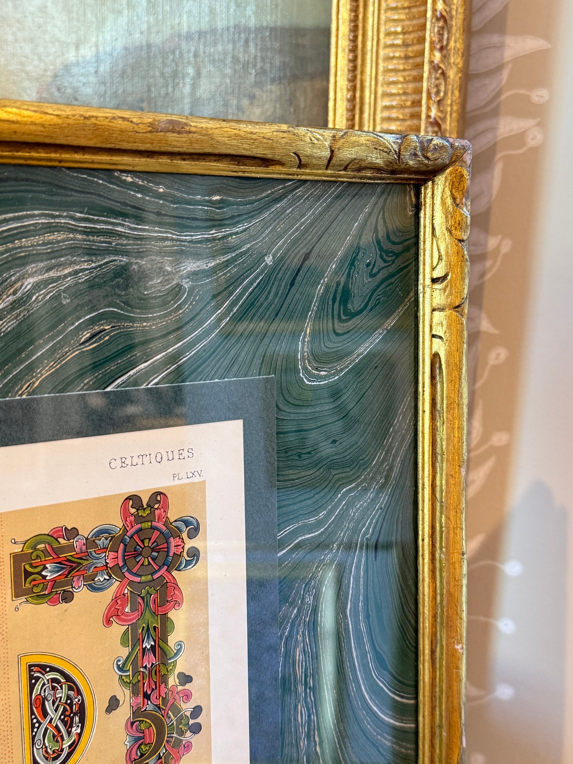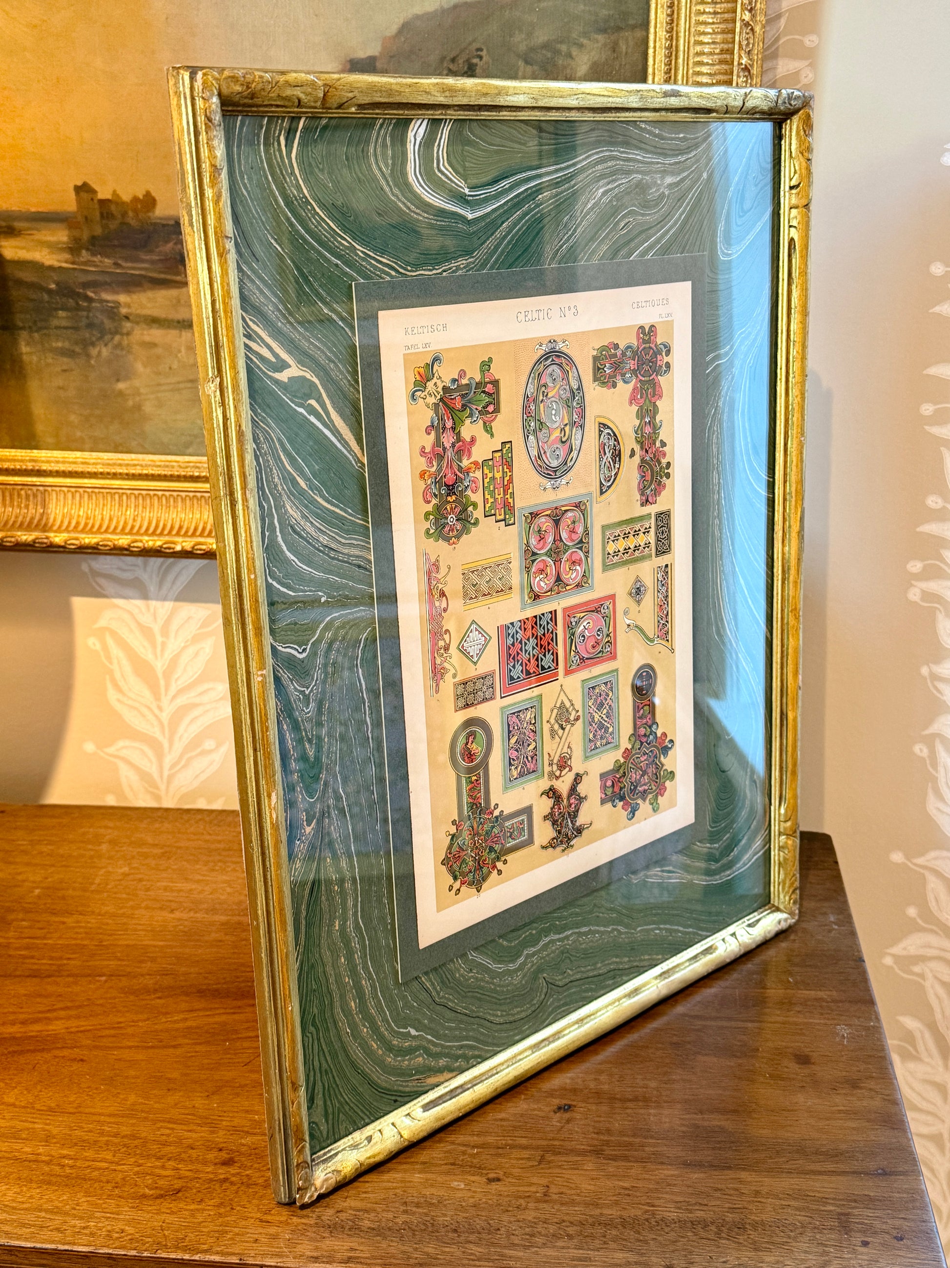 19th century colored lithograph of Celtic designs from The Grammar of Ornament (1856). Mounted on green hand marbled paper. Artwork in beautifully carved and gilded frame measures 21" x 16.75". Artwork and frame in very good condition with light, age appropriate wear. Coordinating piece shown in last photo is available in a separate listing.