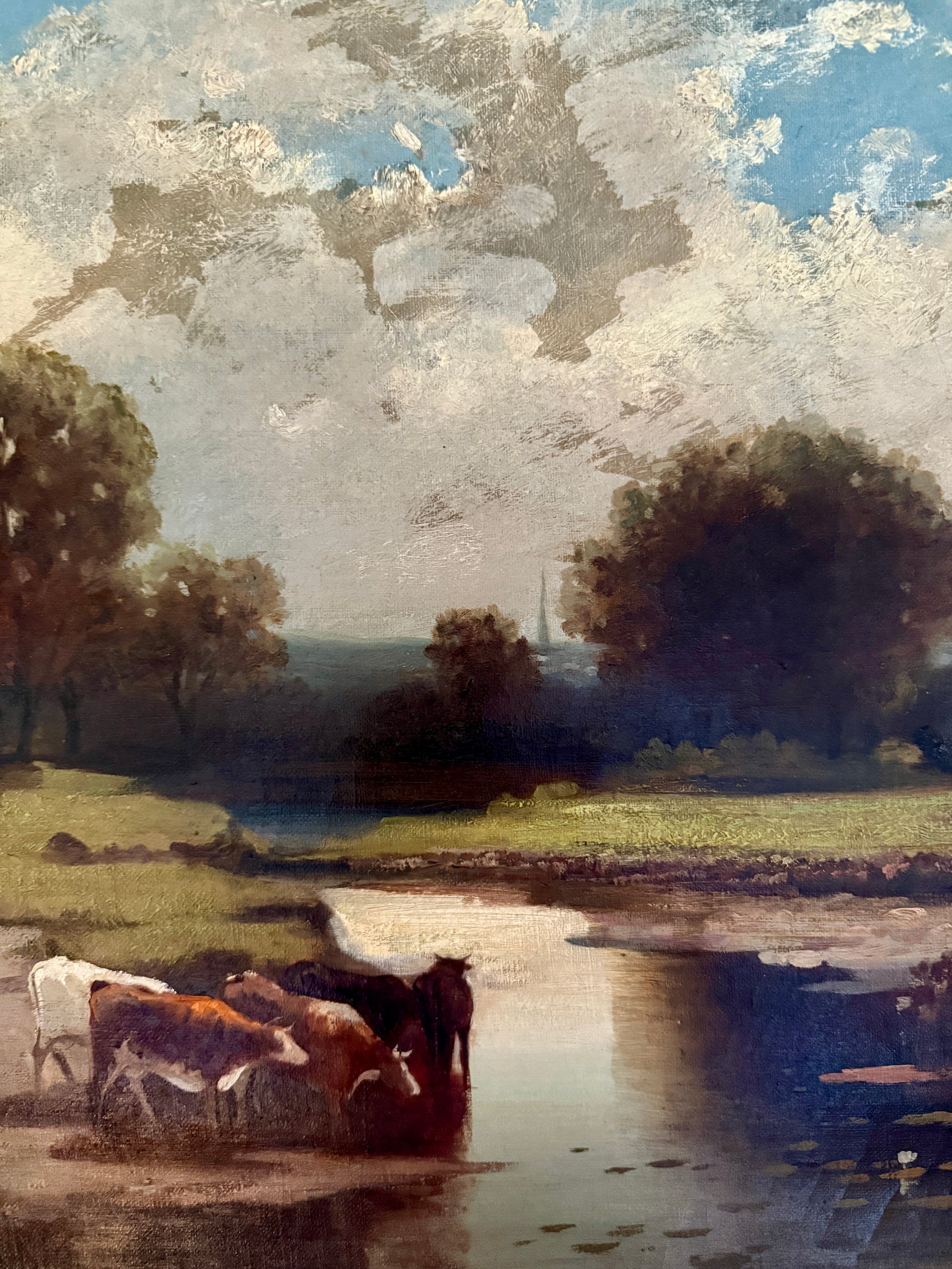 English, 19th century oil on canvas landscape with cows grazing at the edge of a lily pad dotted pond. Signed and dated "A.M. Karslake 1887" at lower right. Artwork in 19th century, ornately floral decorated and gilded frame measures 22.5" x 28.25". Artwork and frame in very good condition with scattered, age appropriate wear.
