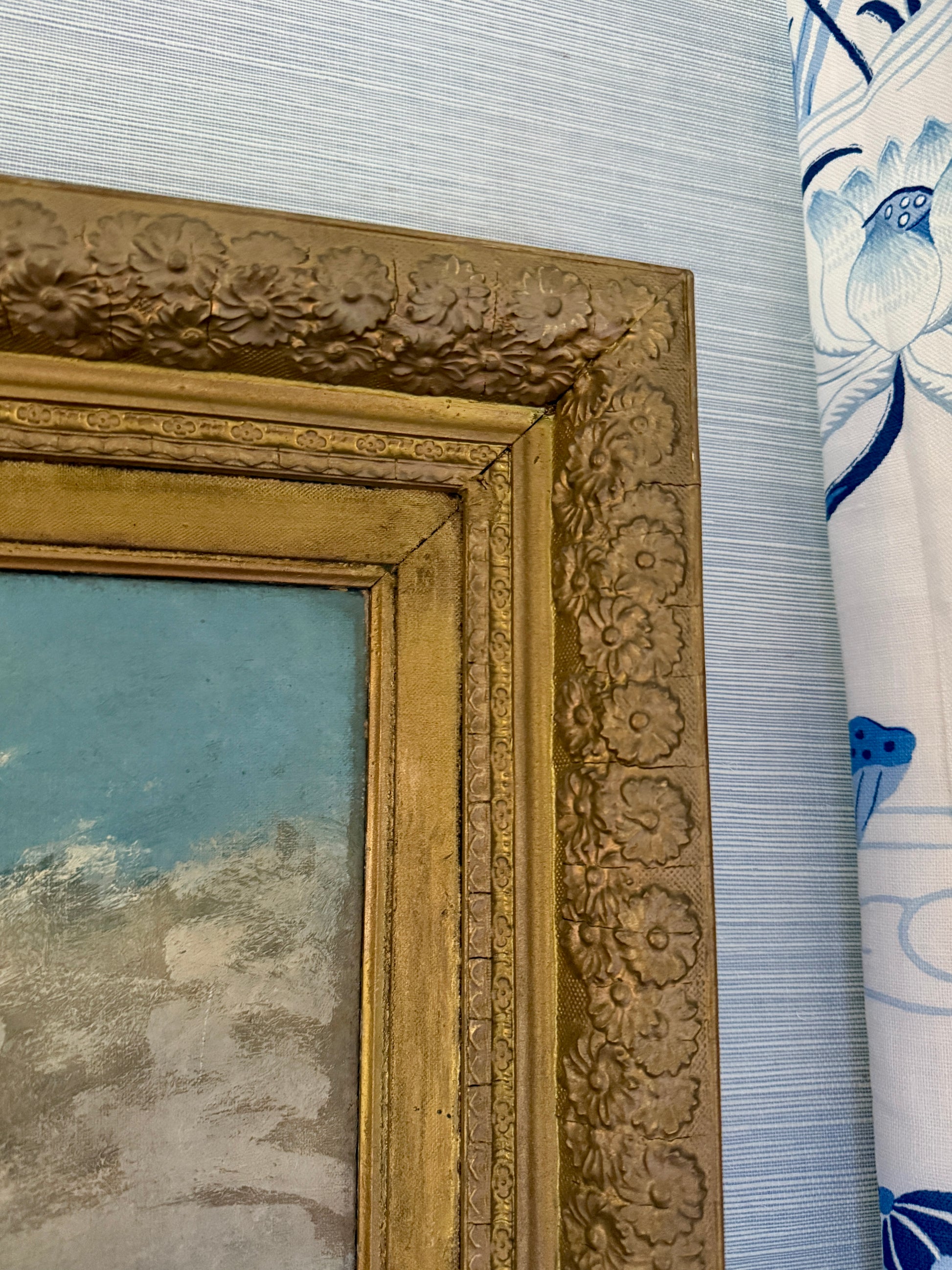 19th Century English Rural Landscape with Cows and Lilies Oil Painting in Floral Gilded Frame
